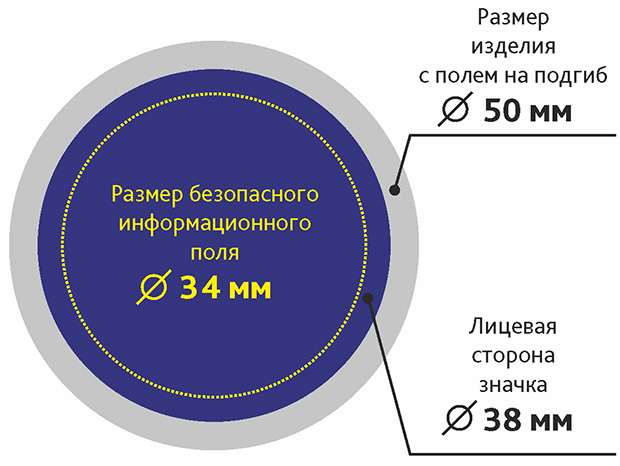 Размер изделия с полем на подгиб: диаметр 50 мм;